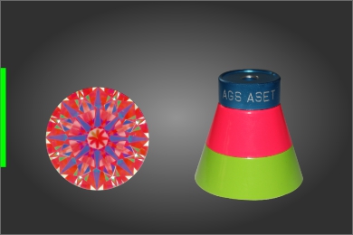 The Ideal-scope is based on a principle discovered by Mr. Okuda in the 1970’s. A 10x lens with a hot red / pink reflector in front of the diamond has a central viewing hole, which allows you to see just how much of the red / pink light refracts back from the diamond.